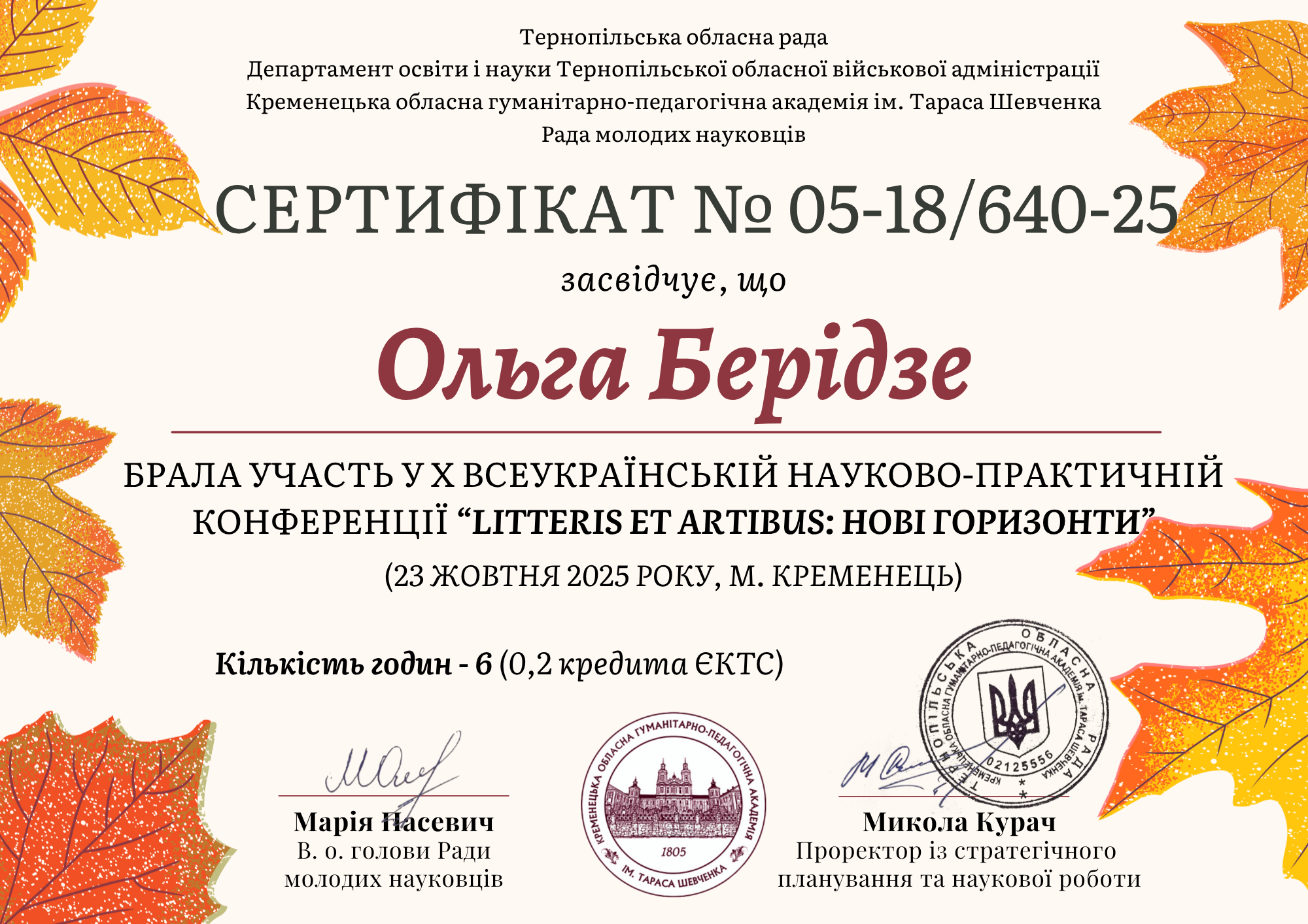 23 жовтня 2025 року, викладачки Кременецького лісотехнічного фахового коледжу - Ольга Берідзе та Надія Швець прийняли онлайн участь на платформі Zoom LITTERIS ET ARTIBUS: ДЕСЯТИЙ ГОРИЗОНТ у ювілейній Х Всеукраїнські науково-практичні конференції. В ході роботи конференції було висвітлено наукові дослідження, питання впровадження новітніх підходів у сфері раціонального використання біоресурсів, охорони навколишнього середовища.