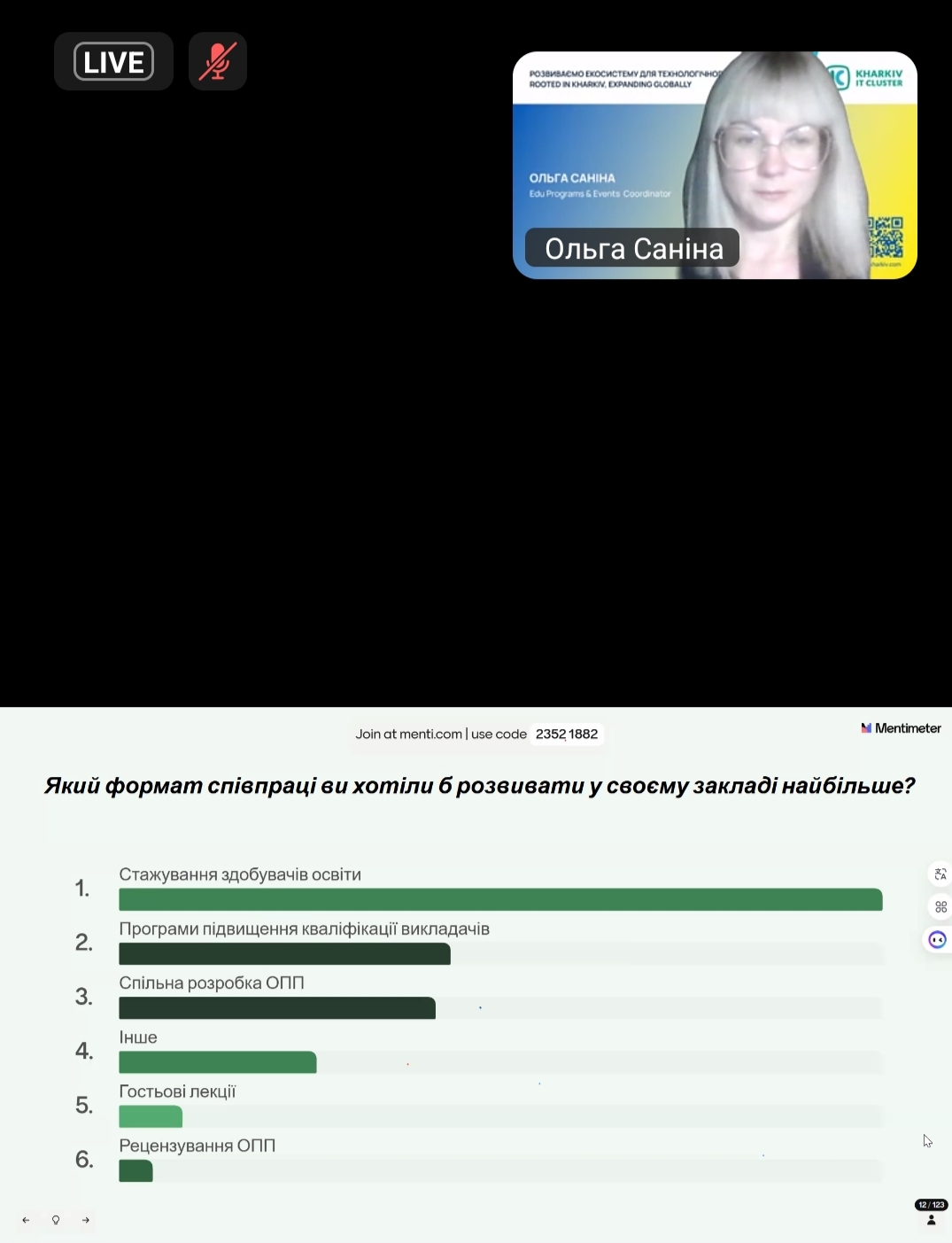 Голова циклової комісії лісогосподарських дисциплін Кременецького лісотехнічного фахового коледжу Наталія Нагорна долучилася до онлайн-зустрічі Tech Edu Up, організованої Kharkiv IT Cluster.